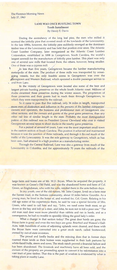 Through the Central Railroad, Lane was also a gateway from much of the Lowcountry to Columbia, and for approximately 70 years the railroads of the large farm and home site of Mr. W.D. Bryan. When he acquired the property, it was known as Green's Old Field, and was the abandoned home and farm of Col. Green, an Englishman, who with his wife, resided there in the ante-bellum days.
